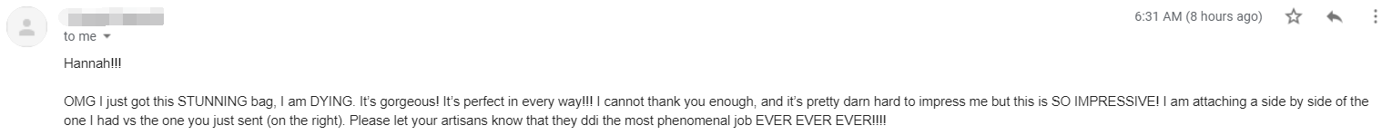 - Final Details Video – We send a video to confirm the bag meets your expectations
