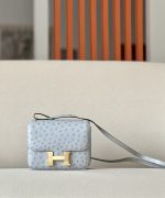 The bag features a long shoulder strap , including an H buckle on the flap.