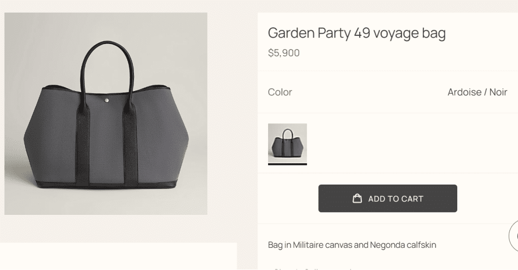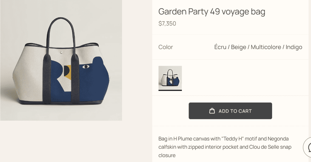 Right now, a canvas Garden Party 49 Voyage is listed on Hermès’ website for $5,600. (Update: After the second price increase this year, it has risen to $5,900. Another version with the “Teddy H” motif is priced at $7,350)