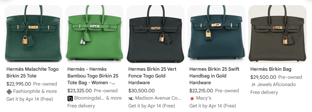 The prices here can vary a lot. A Birkin 25 in green Togo is already rare, with a base price of $13,000 to $15,000.