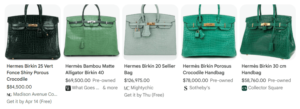 Popular shades like Vert Jade, Vert Emeraude, Bambou, Vert Rousseau and Vert Criquet – especially when paired with Birkin, Kelly, or in exotic leather – can resell for 120% to 160% of the original price. Some rare combinations even go for more.
