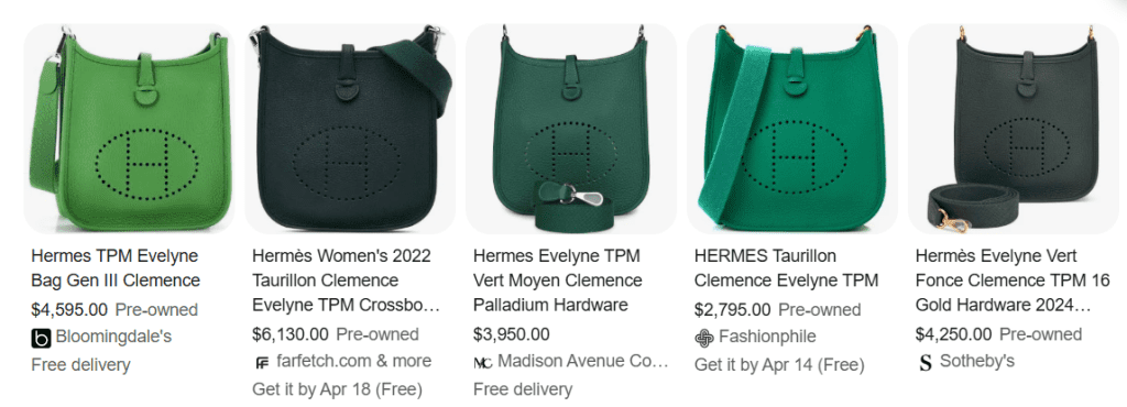 On the resale market, the prices can go way up. For example, a Clemence leather Evelyne TPM is $2,300 at retail, but in popular green shades, it can easily go for $3,000 to $4,000 on resale platforms, and the ones in rare shades like Vert Cypress can go as high as $6,000.